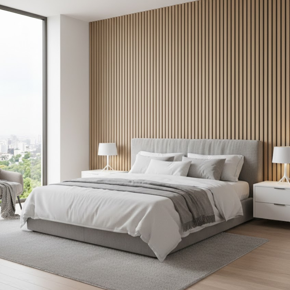 Smoked oak acoustic slat panels feature a bold, contemporary tone with strong acoustic performance.